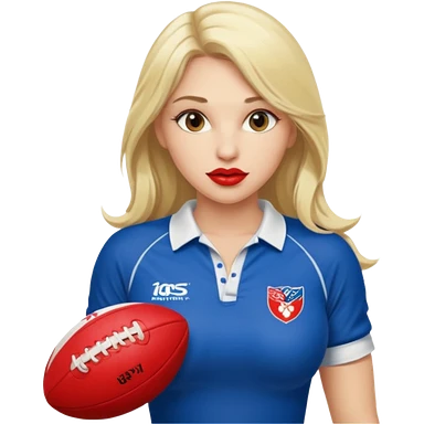 Sexy blond female. Long hair. Red lips. Big boobs. Wearing only rugby jersey. Sexy pose emoji