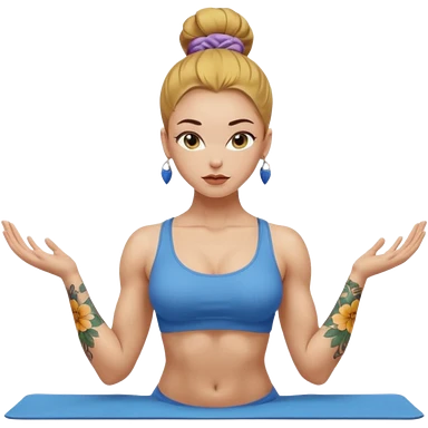 sexy and fit, well muscled torso and biceps, european sexy girl, nude body, yellow-brown slavic hair in bun, sexy nude body, floral tattoes, blue-grey eyes, active yoga, sexy colored lips emoji