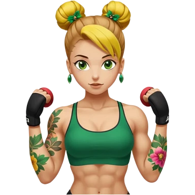 sexy and fit, well muscled torso and biceps, european sexy girl, nude body, yello-brown slavic hair in bun, sexy nude body, floral tattoes, green emerald eyes, doing sports emoji