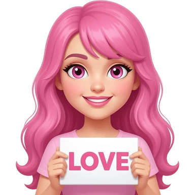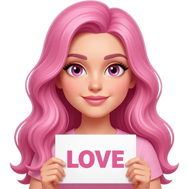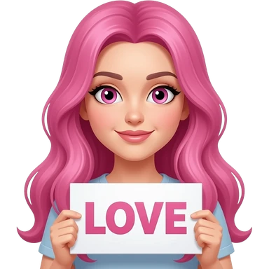 sexy girl with long pink hair and pink eyes holding LOVE sign emoji