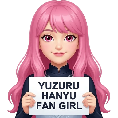 sexy girl with long pink hair and pink eyes holding YUZURU HANYU FAN GIRL sign emoji