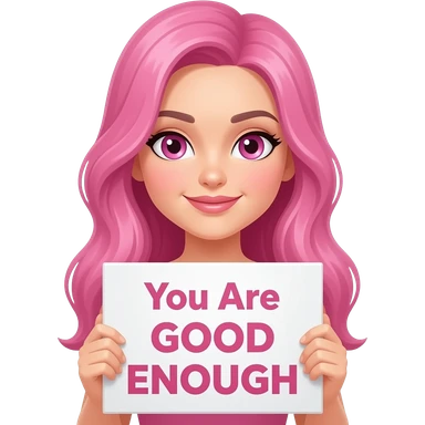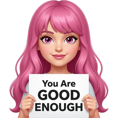 sexy girl with long pink hair and pink eyes holding You Are GOOD ENOUGH sign emoji