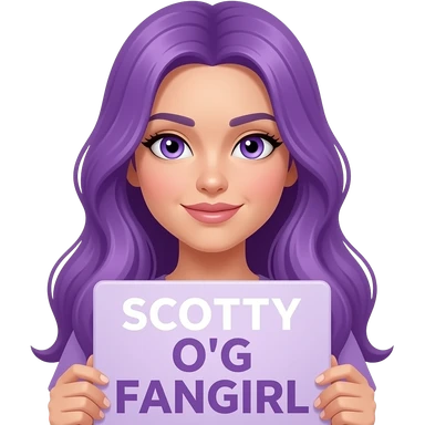 sexy girl with long purple hair and purple eyes holding a SCOTTY O'G FANGIRL sign emoji
