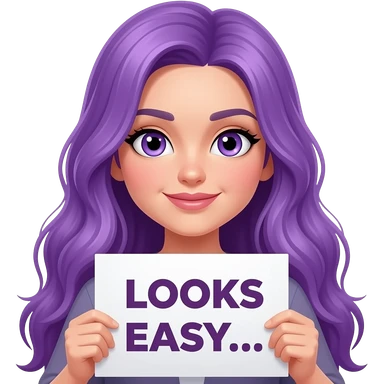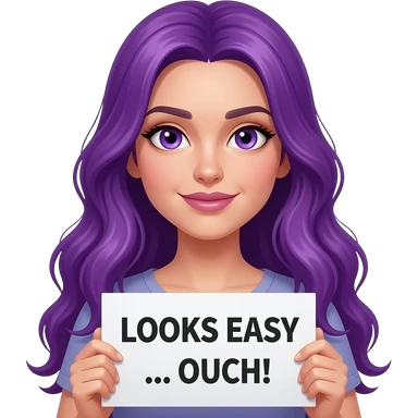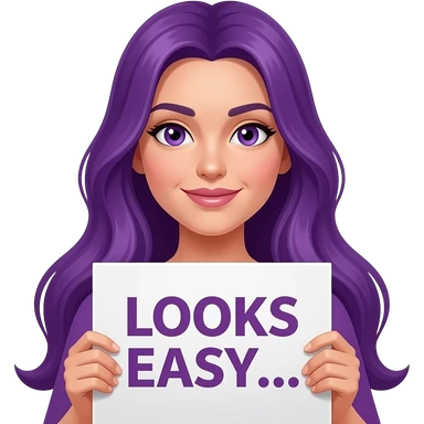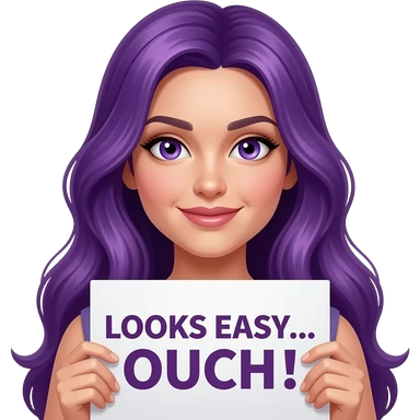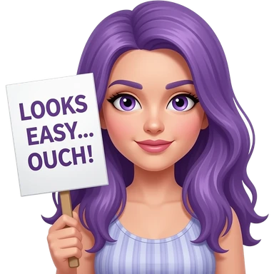 sexy girl with long purple hair and purple eyes holding a LOOKS EASY... OUCH!sign emoji
