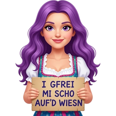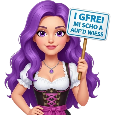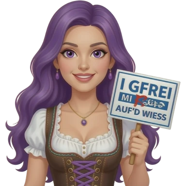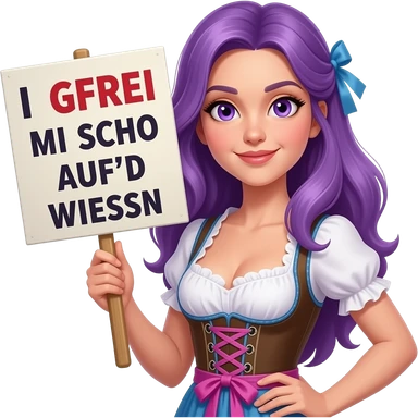 sexy girl with long purple hair and purple eyes wearing a dirndl holding a I GFREI MI SCHO AUF'D WIESN sign emoji