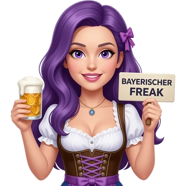 sexy girl with long purple hair and purple eyes wearing a dirndl holding a BAYERISCHER FREAK sign emoji