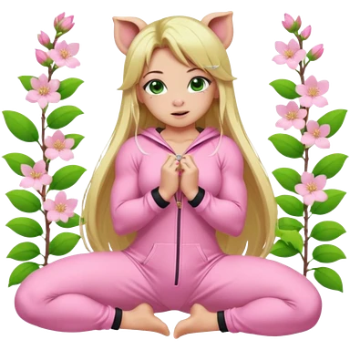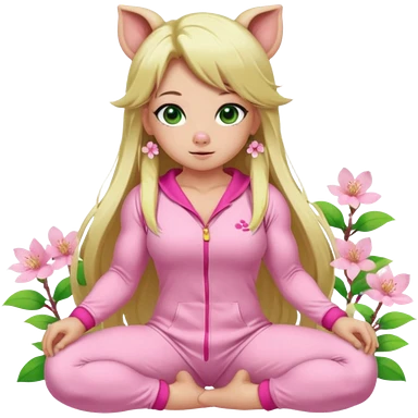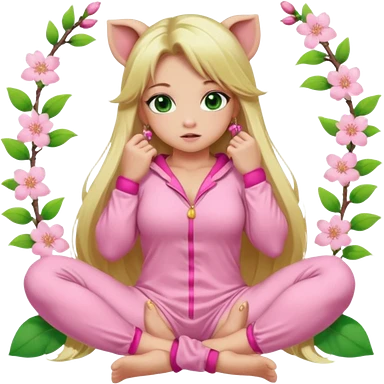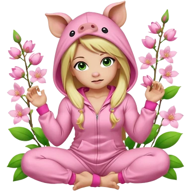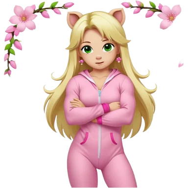 sexy and muscled, full body, in pink kegurumi pig pijamas, sexy girl, long blond hair, beautiful green eyes, makeup, earrings, muscled, surrounded by pink flowers and sakura petals emoji