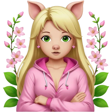 sexy and muscled, full body, in pink kegurumi pijamas, pig hood, sexy girl, long blond hair, beautiful green eyes, makeup, earrings, muscled, surrounded by pink flowers and sakura petals emoji