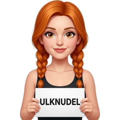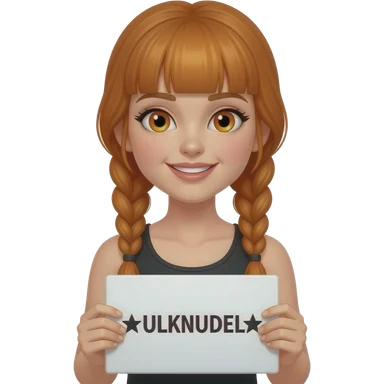 sexy girl with long ginger braids and ginger eyes wearing a black tanktop is holding a white sign with ULKNUDEL written on it emoji