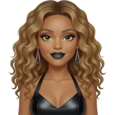 Beyonce from Destiny's Child with hazel eyes, long golden brown 1990s curly hair, black eyeshadow, black lipstick, black metallic halter dress, earrings emoji