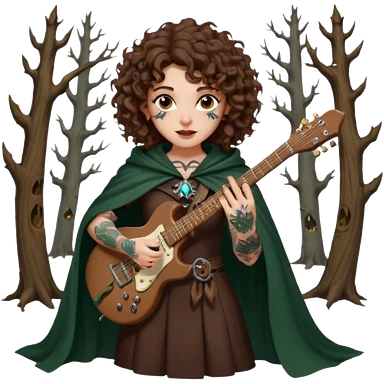 Brown eyes, brown hair curly forest witch playing electric guitar sexual with tattoos...white ethnicity emoji