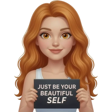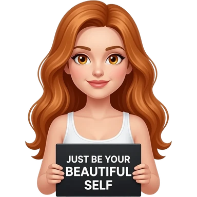 sexy girl with long ginger hair and ginger eyes wearing a white tanktop is holding a black sign with JUST BE YOUR BEAUTIFUL SELF written on it emoji