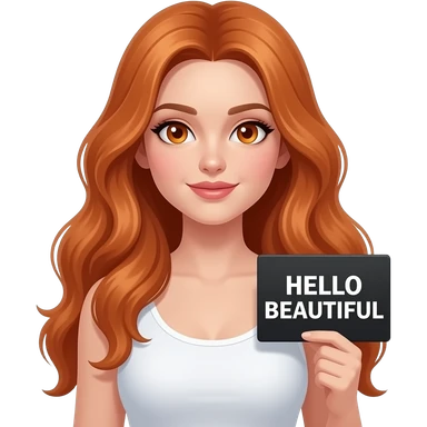 sexy girl with long ginger hair and ginger eyes wearing a white tanktop is holding a black sign with HELLO BEAUTIUFL written on it emoji
