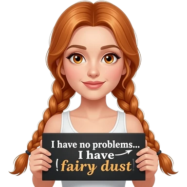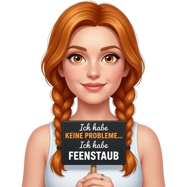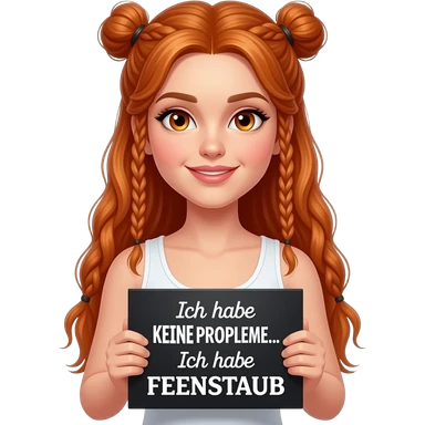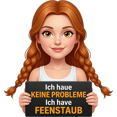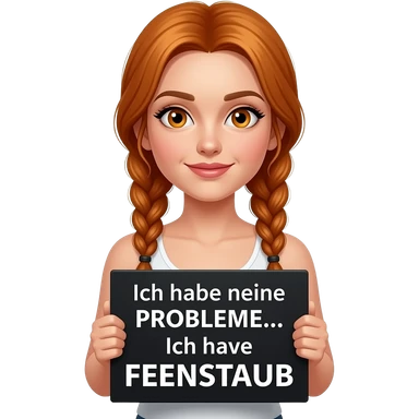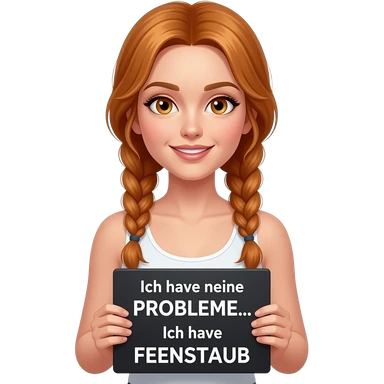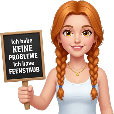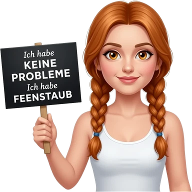 sexy girl with long ginger braids and ginger eyes wearing a white tanktop holds a black sign with Ich habe KEINE PROBLEME... Ich habe FEENSTAUB written on it emoji