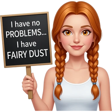 sexy girl with long ginger braids and ginger eyes wearing a white tanktop holds a black sign with Ich habe KEINE PROBLEME Ich habe FEENSTAUB written on it emoji
