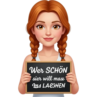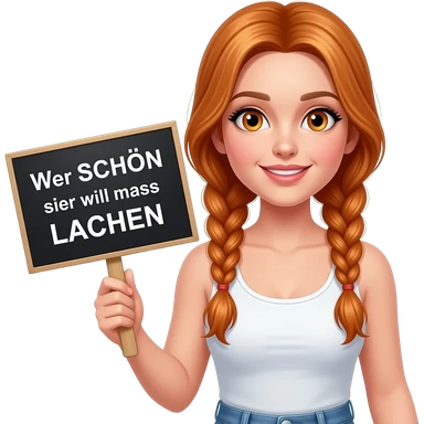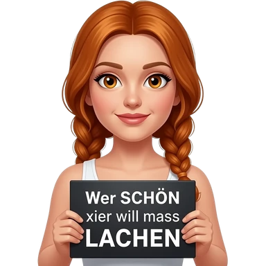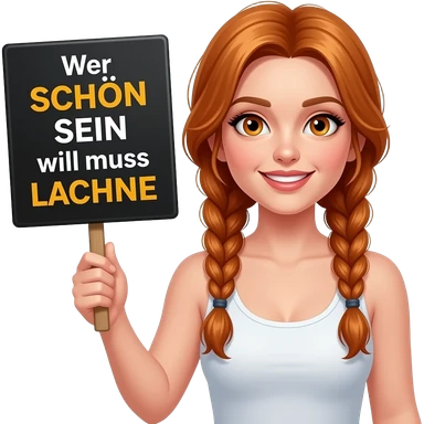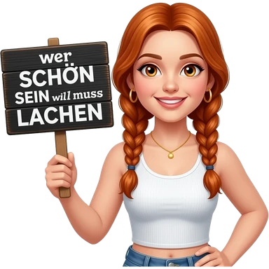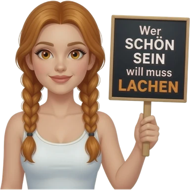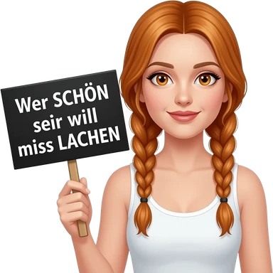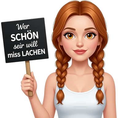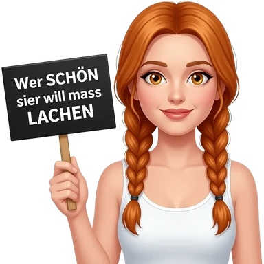 sexy girl with long ginger braids and ginger eyes wearing a white tanktop is holding a black sign with Wer SCHÖN SEIN will muss LACHEN written on it emoji