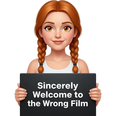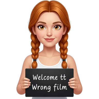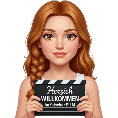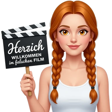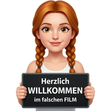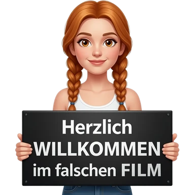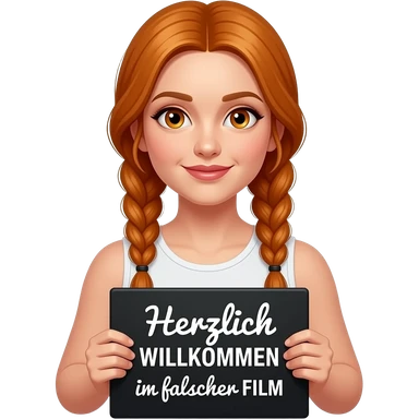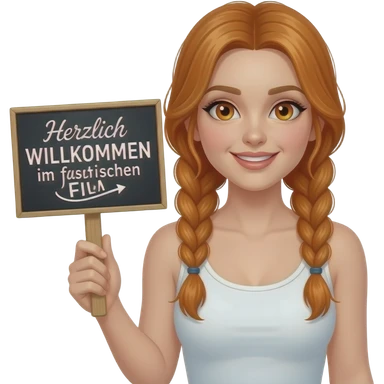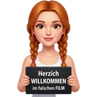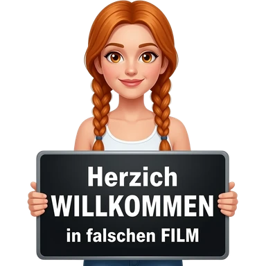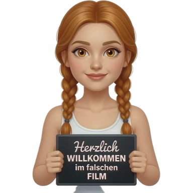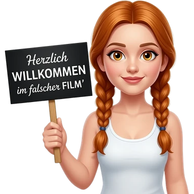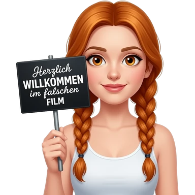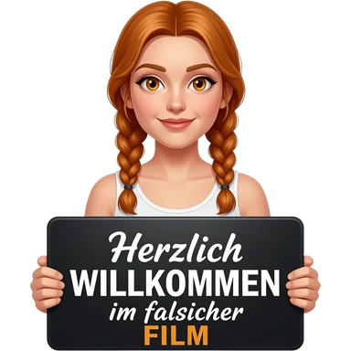 sexy girl with long ginger braids and ginger eyes wearing a white tanktop is holding a black sign with Herzlich WILLKOMMEN im falschen FILM written on it emoji