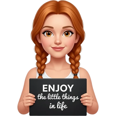sexy girl with long ginger braids and ginger eyes wearing a white tanktop is holding a black sign with ENJOY the little things in life written on it emoji