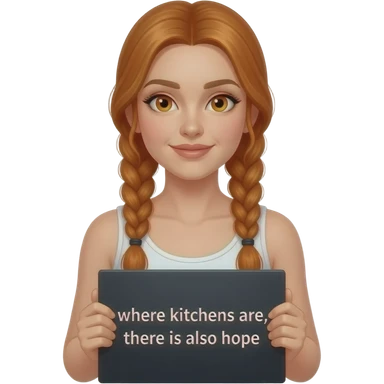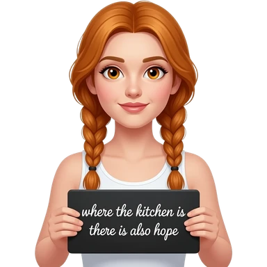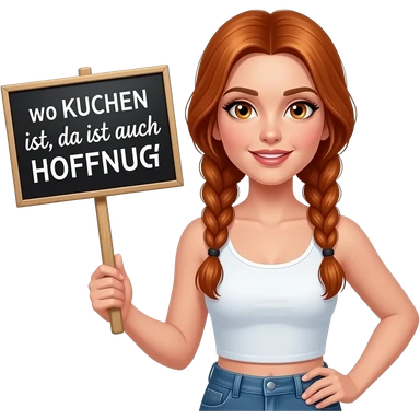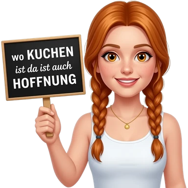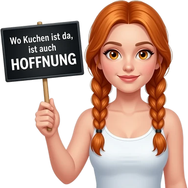 sexy girl with long ginger braids and ginger eyes wearing a white tanktop is holding a black sign with wo KUCHEN ist, da ist auch HOFFNUNG written on it emoji