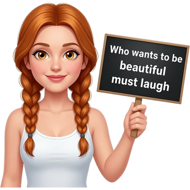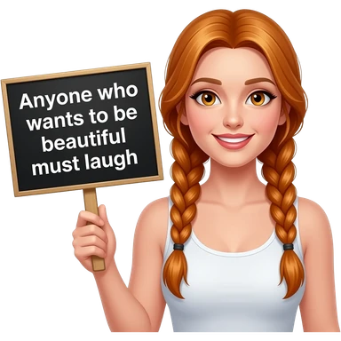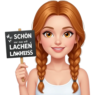 sexy girl with long ginger braids and ginger eyes wearing a white tanktop is holding a black sign with LACHEN ist die schönste SPRACHE der WELT written on it emoji | AI Emoji Generator