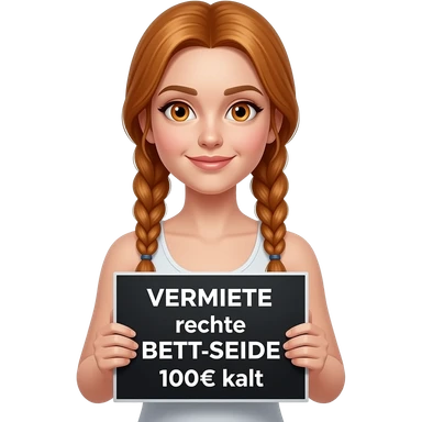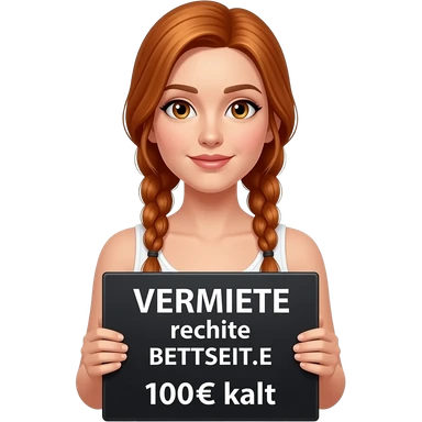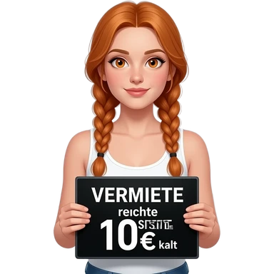 sexy girl with long ginger braids and ginger eyes wearing a white tanktop is holding a black sign with VERMIETE rechte BETTSEITE 100€ kalt written on it emoji
