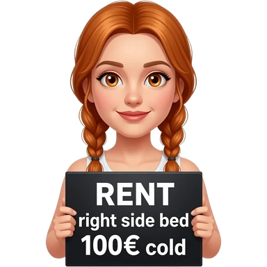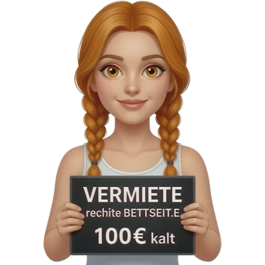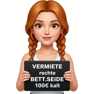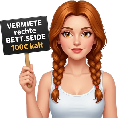 sexy girl with long ginger braids and ginger eyes wearing a white tanktop is holding a black sign with VERMIETE rechte BETTSEITTE 100€ kalt written on it emoji