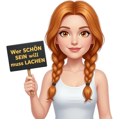 sexy girl with long ginger braids and ginger eyes wearing a white tanktop is holding a black sign with Wer SCHÖN sein will muss LACHEN written on it emoji