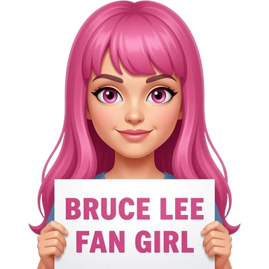 sexy girl with long pink hair and pink eyes holding BRUCE LEE FAN GIRL sign emoji