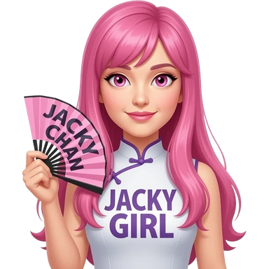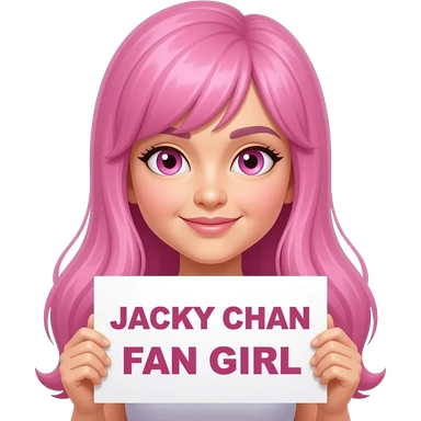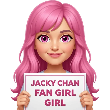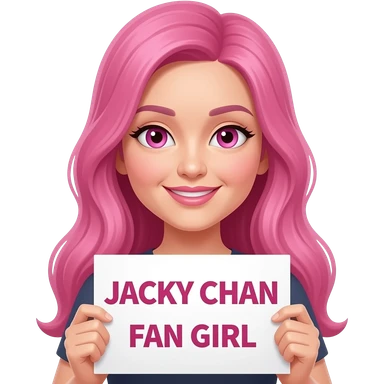 sexy girl with long pink hair and pink eyes holding JACKY CHAN FAN GIRL sign emoji