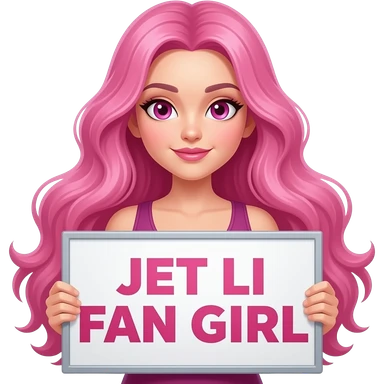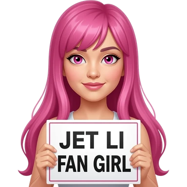sexy girl with long pink hair and pink eyes holding JET LI FAN GIRL sign emoji
