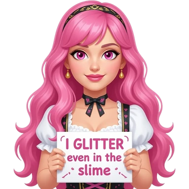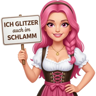 sexy girl with long pink hair and pink eyes wearing a dirndl holding a ICH GLITZER auch im SCHLAMM sign emoji