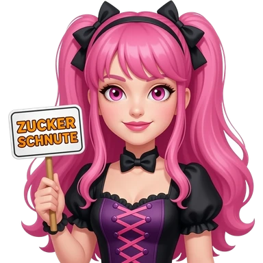 sexy girl with long pink hair and pink eyes wearing a halloween dress holding a ZUCKER SCHNUTE sign emoji