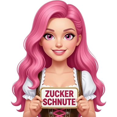 sexy girl with long pink hair and pink eyes wearing a dirndl holding a ZUCKER SCHNUTE sign emoji