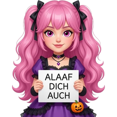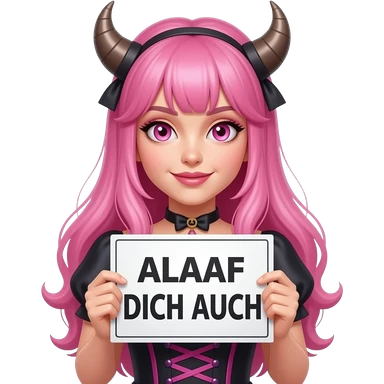 sexy girl with long pink hair and pink eyes wearing a halloween dress holding a ALAAF DICH AUCH sign emoji