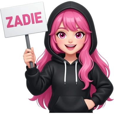sexy girl with long pink hair and pink eyes wearing a black hoodie with the hood atop her head holding a ZADIE sign emoji