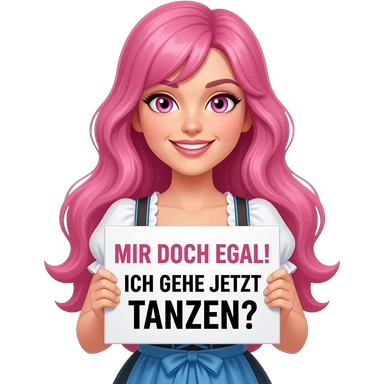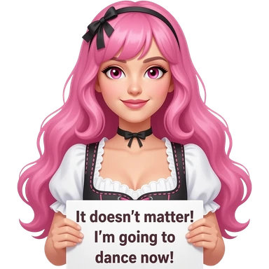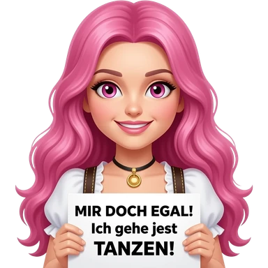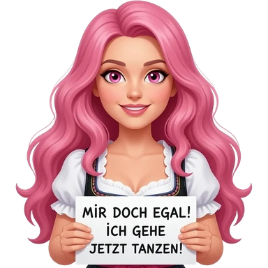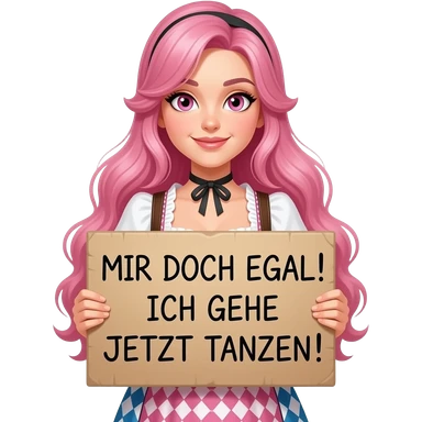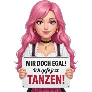 sexy girl with long pink hair and pink eyes wearing a dirndl holding a MIR DOCH EGAL! ICH GEHE JETZT TANZEN! sign emoji