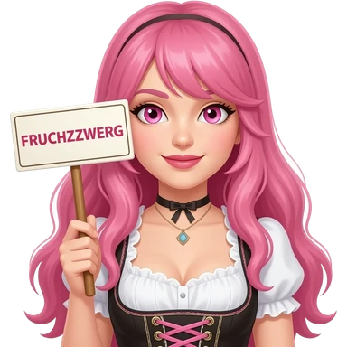 sexy girl with long pink hair and pink eyes wearing a dirndl holding a FRUCHTZWERG sign emoji