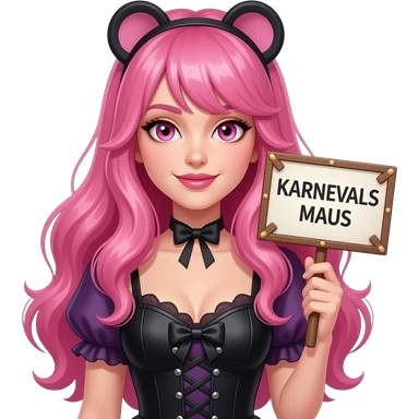 sexy girl with long pink hair and pink eyes wearing a halloween dress holding a KARNEVALS MAUS sign emoji
