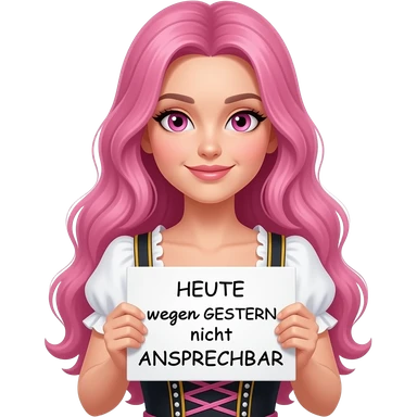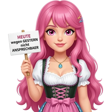 sexy girl with long pink hair and pink eyes wearing a dirndl holding a HEUTE wegen GESTERN nicht ANSPRECHBAR sign emoji