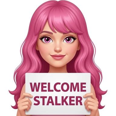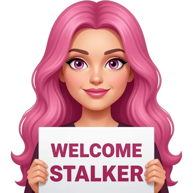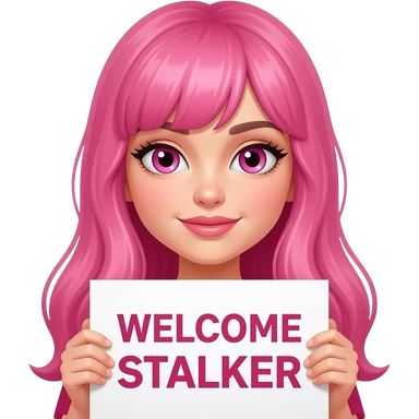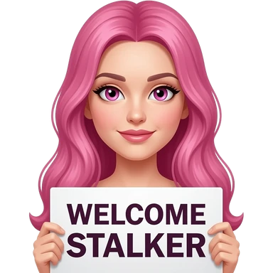 sexy girl with long pink hair and pink eyes wearing a holding a WELCOME STALKER sign emoji