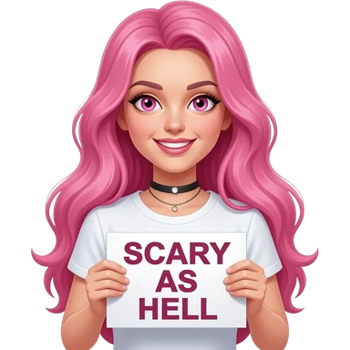 sexy girl with long pink hair and pink eyes wearing a holding a SCARY AS HELL sign emoji