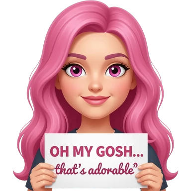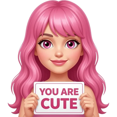 sexy girl with long pink hair and pink eyes wearing a holding a YOU ARE CUTE sign emoji
