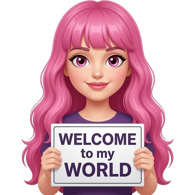 sexy girl with long pink hair and pink eyes wearing a holding a WELCOME to my WORLDsign emoji