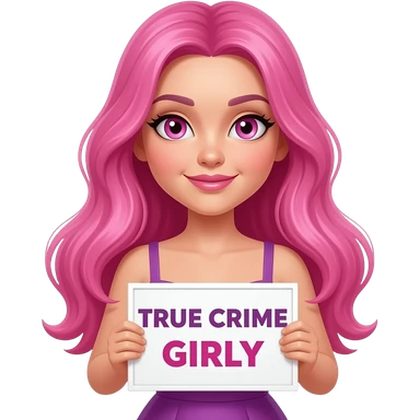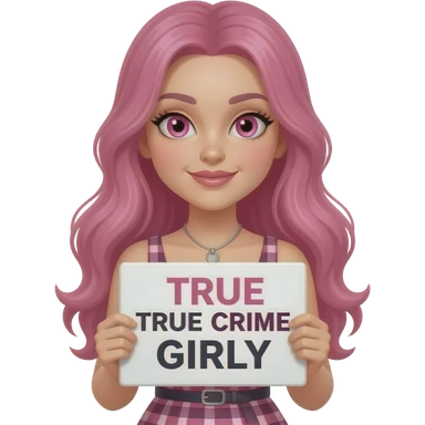 sexy girl with long pink hair and pink eyes wearing a dress holding a TRUE CRIME GIRLY sign emoji