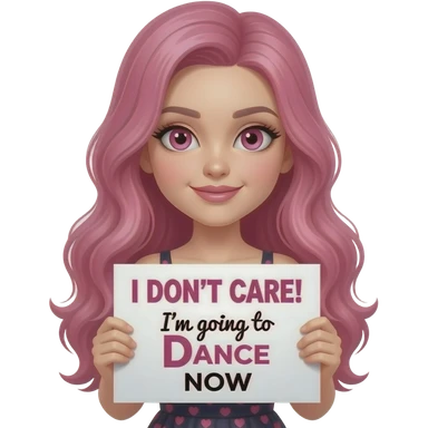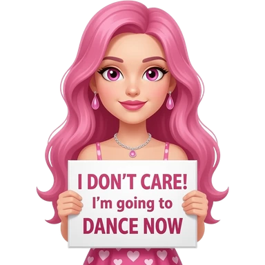 sexy girl with long pink hair and pink eyes wearing a dress holding a I DON'T CARE! I'm going to DANCE NOW sign emoji