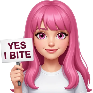 sexy girl with long pink hair and pink eyes wearing a holding a YES I BITE sign emoji