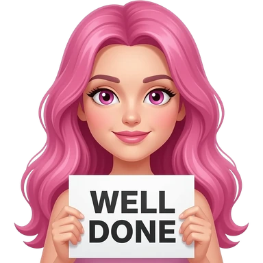 sexy girl with long pink hair and pink eyes wearing a holding a WELL DONE sign emoji
