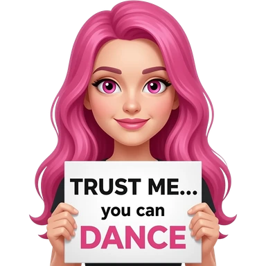 sexy girl with long pink hair and pink eyes wearing a holding a TRUST ME... you can DANCE sign emoji