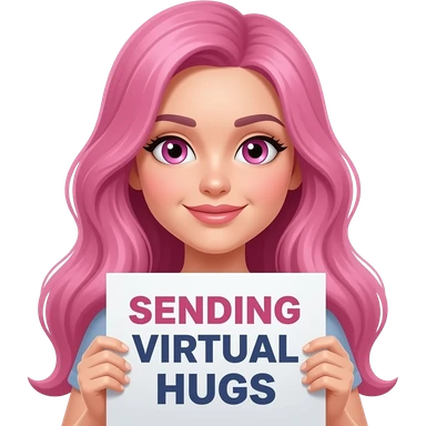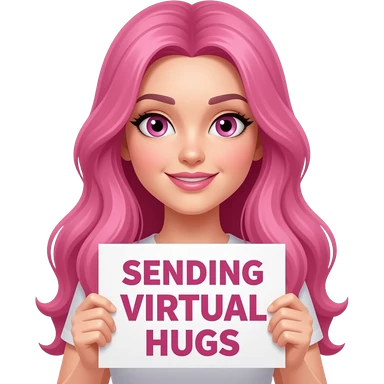 sexy girl with long pink hair and pink eyes wearing a holding a SENDING VIRTUAL HUGS sign emoji