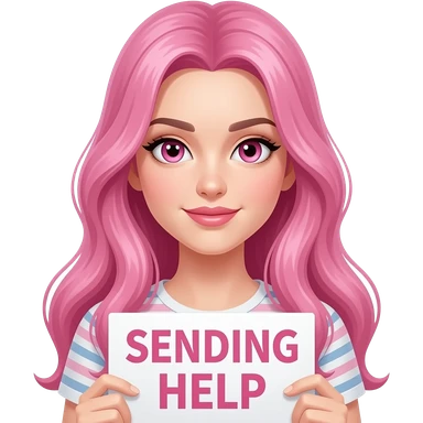 sexy girl with long pink hair and pink eyes wearing a holding a SENDING HELP sign emoji